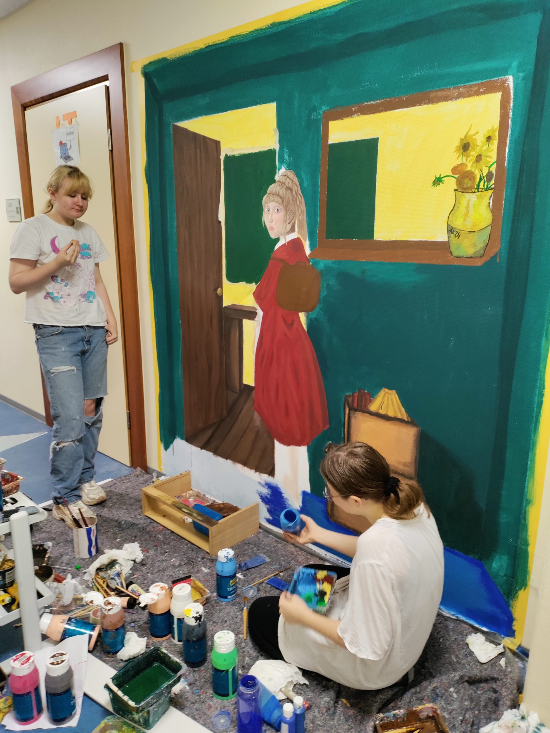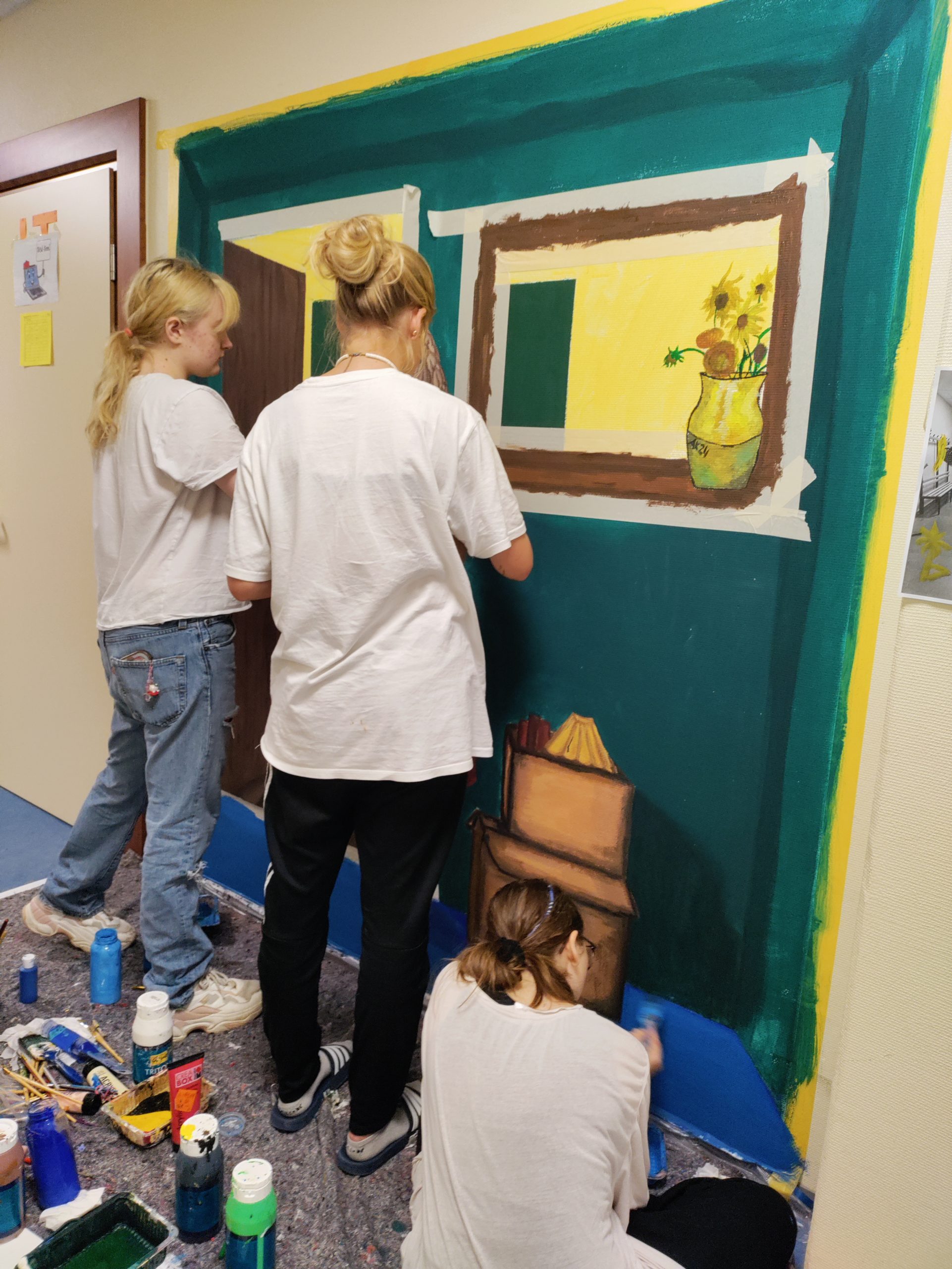 In der Mädchenrealschule Maria Stern leuchtet seit Juli 2024 eine neue Wandmalerei! Vier Abschlussschülerinnen der letzten 10 b, Helena Jorgenson, Eva Zechanig, Zora Schlosser und Sophie Wimmer haben sich die ehrgeizige Aufgabe gestellt, nach der schriftlichen und mündlichen Abschlussprüfung 2024 eine Wand zu bemalen, um sich an der Schule zu „verewigen“, und so entstand ein tolles Gemälde mit einer Maria-Stern Schülerin vor hundert Jahren (Vorbild war hier Vermeers „Mädchen mit dem Perlenohrring“), die in den heutigen IT-Saal läuft und auf die Schülerinnen von heute zurückblickt. Auch van Goghs Sonnenblumen sind auf dem Fenster zum IT-Saal zu sehen, und in alte Kisten sind die Lernmaterialien der letzten sechs Jahre auf Maria Stern gut verpackt. Viele Schülerinnen und Lehrkräfte gehen jeden Tag an dem Gemälde vorbei. Herzlichen Glückwunsch für das Engagement und die tolle Idee für die Verschönerung unseres Schulhauses!